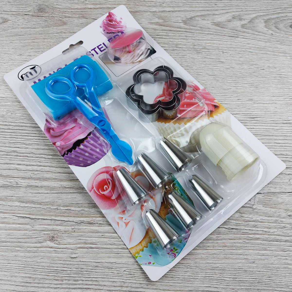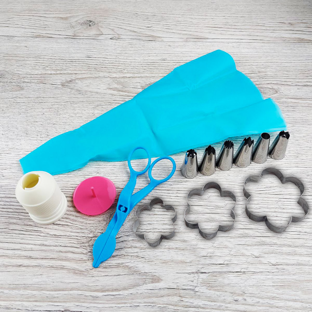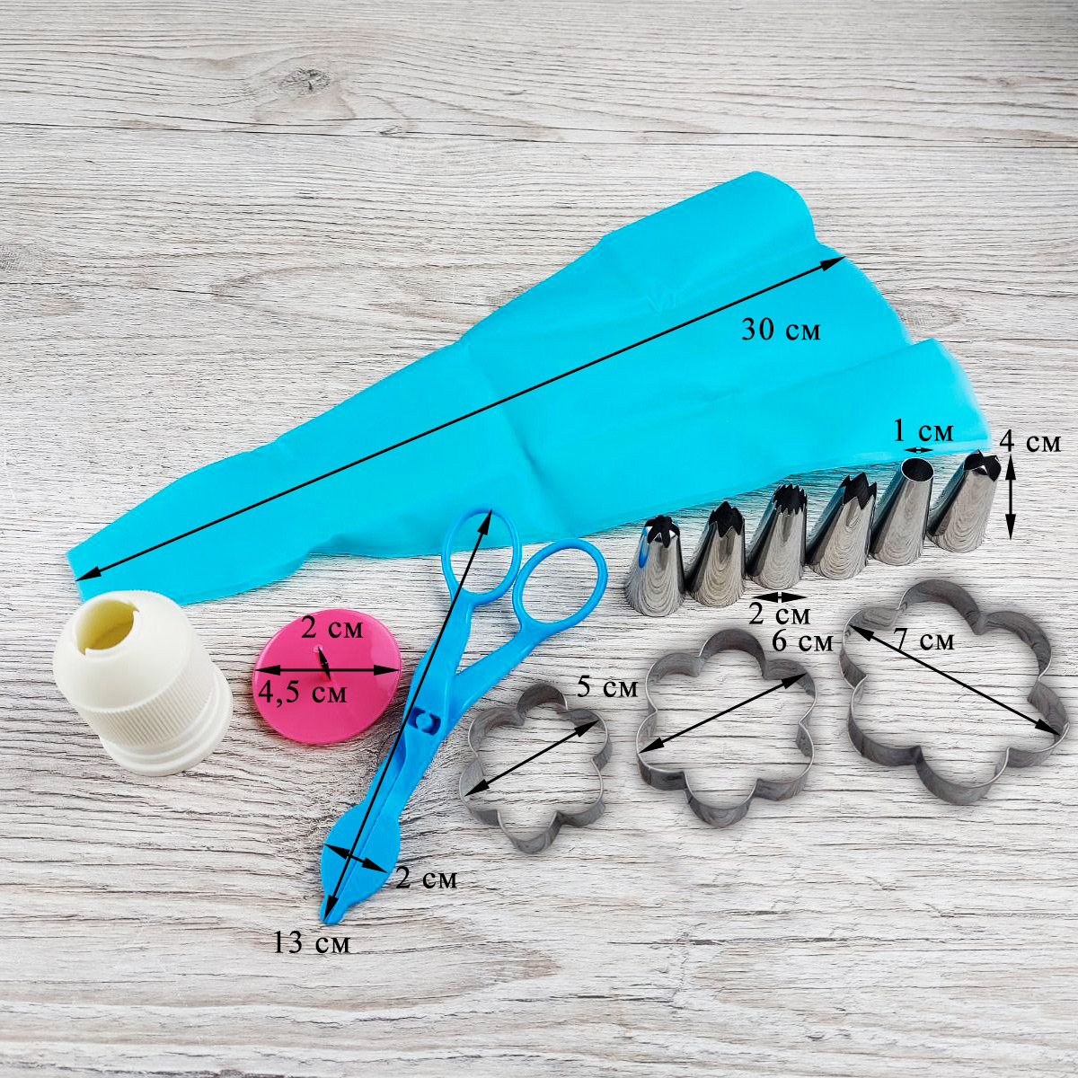 В наборе: 6 насадок для крема, переходник для насадок, кондитерский мешок силиконовый, гвоздь для создания цветов из крема, ножницы для переноса цветов из крема, 3 металлические формы цветочки.