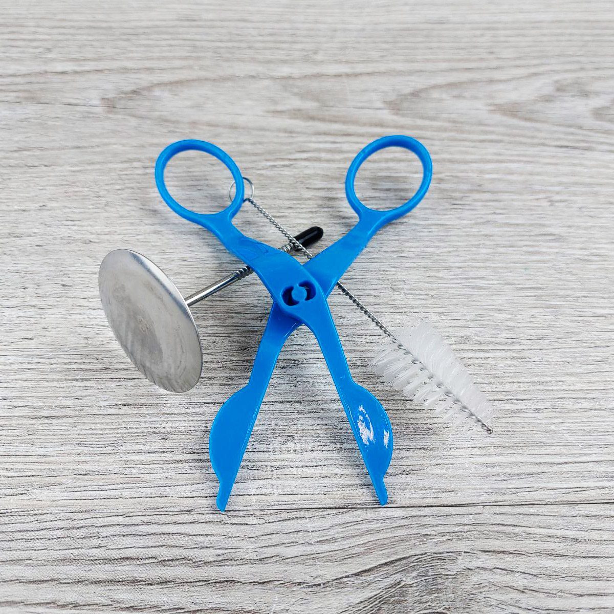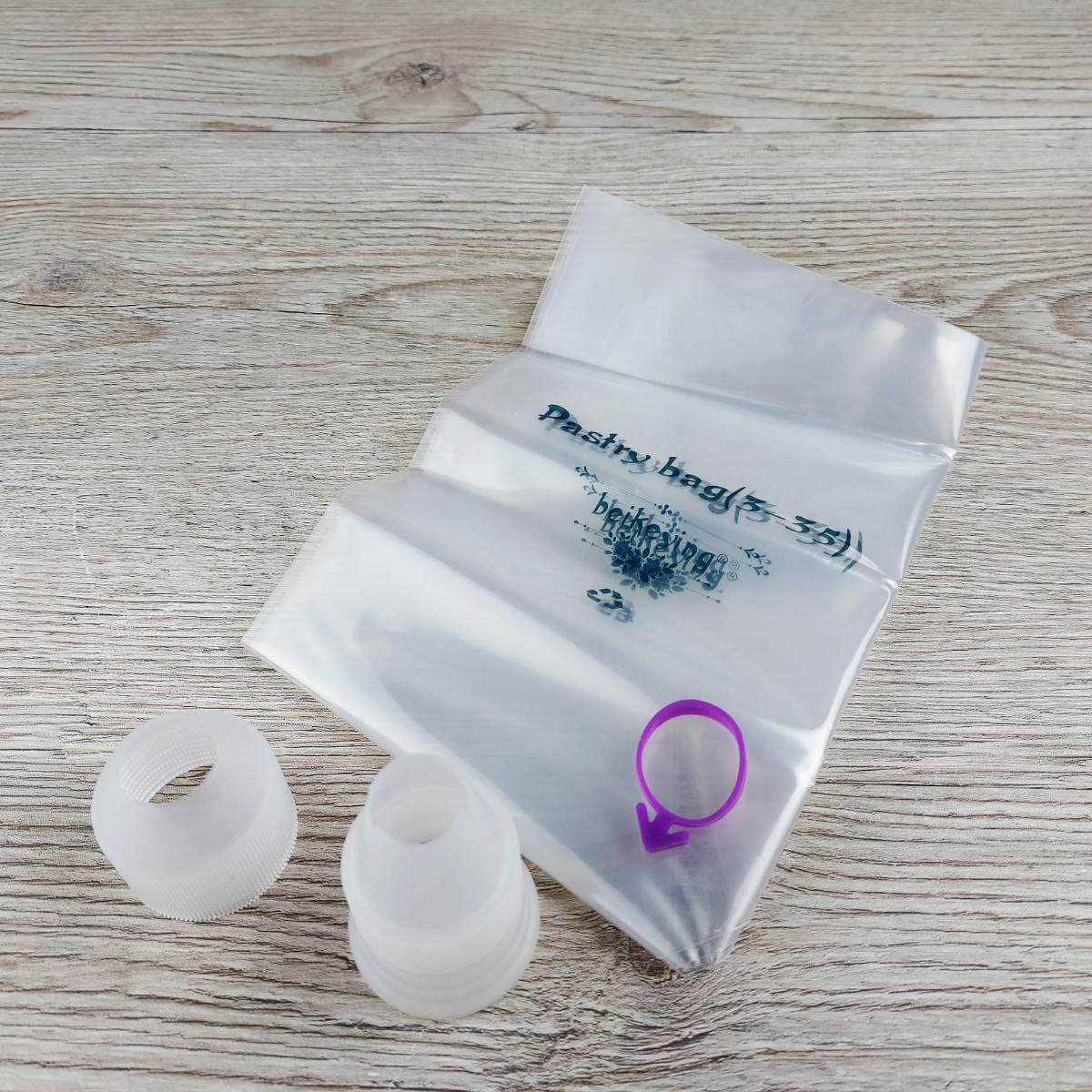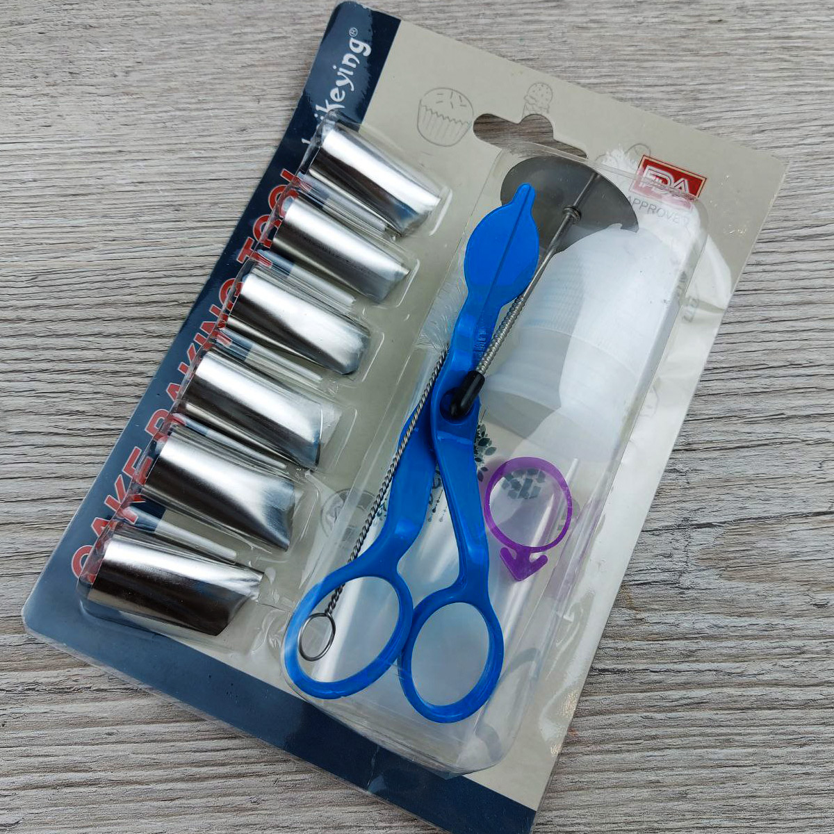 В наборе: 6 насадок лепестки, ножницы, переходник большой, гвоздь кондитерский, зажим для мешков, 3 мешка кондитерских, ершик для чистки насадок.