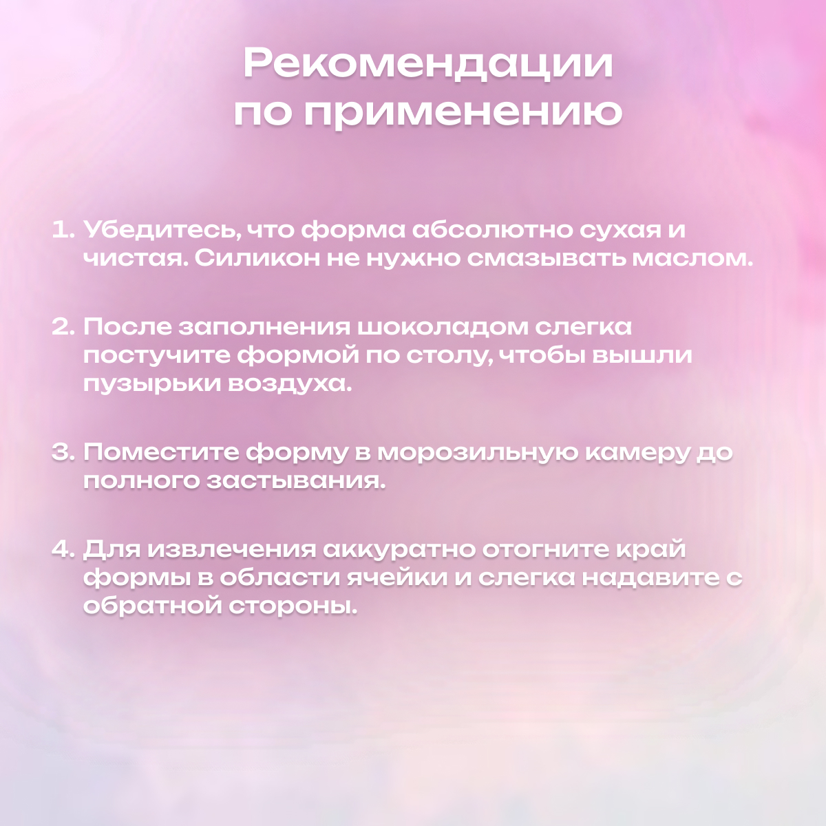 Так же просто с помощью силиконовой формы Вы сможете приготовить любые шоколадные конфеты, леденцы, ириски и прочие лакомства. Создавайте неповторимые кулинарные шедевры!