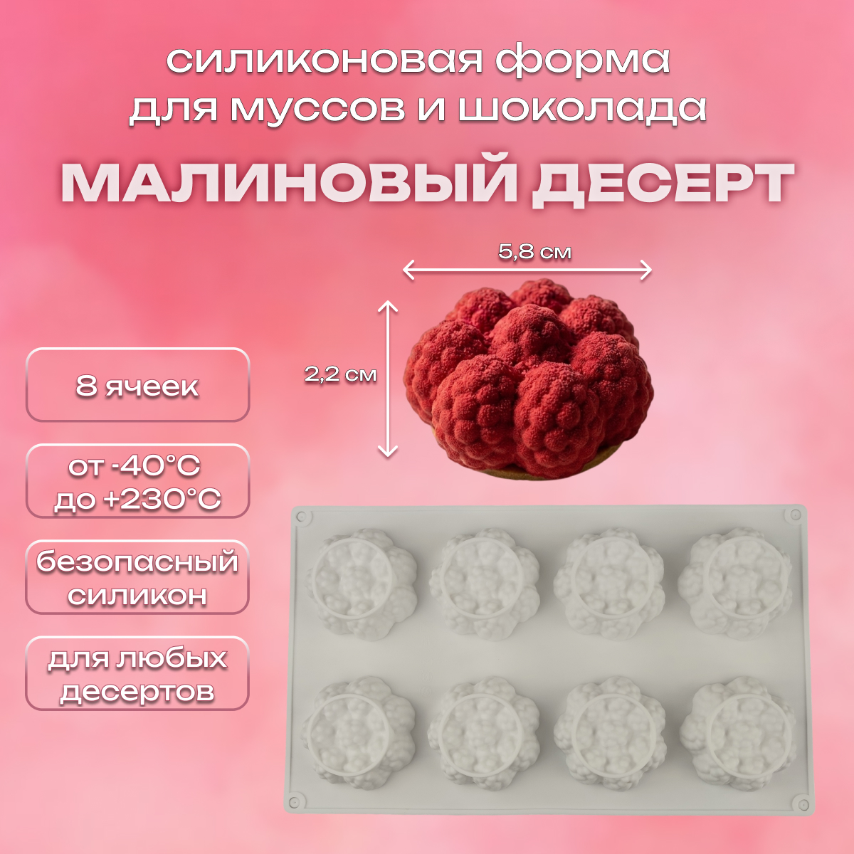 Мечтаете добавить изысканную ягодную нотку в свои кулинарные шедевры? Встречайте нашу элегантную силиконовую форму «Малиновый десерт» — идеальный выбор для тех, кто ценит утончённость и любит радовать близких восхитительными угощениями!