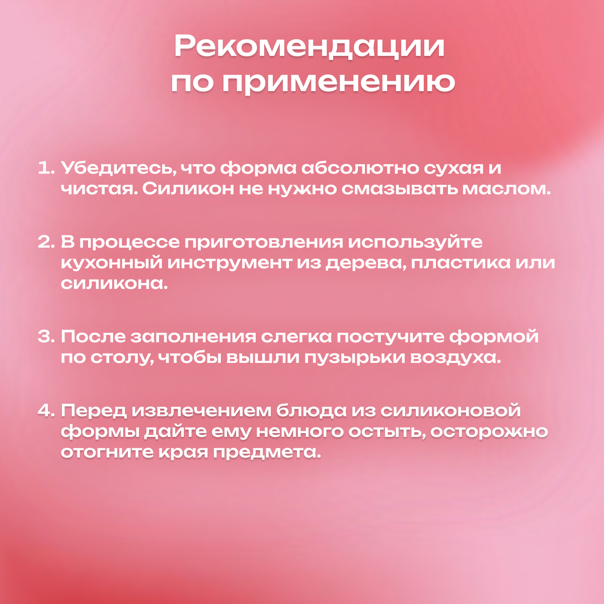 - Безопасность: Изготовлена из пищевого силикона, подходит для морозилки, духовки и микроволновки.