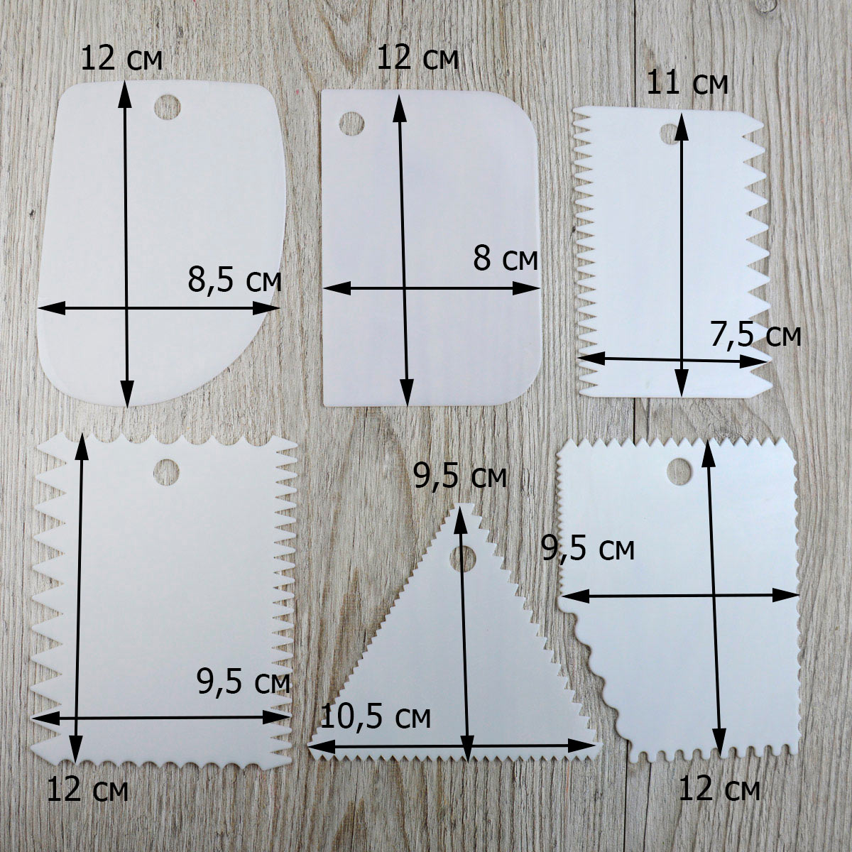 Размеры шпателей:12 см х 8,5 см; 11 см х 7,5 см; 12 см х 9,5 см....толщина ~ 0,2 см