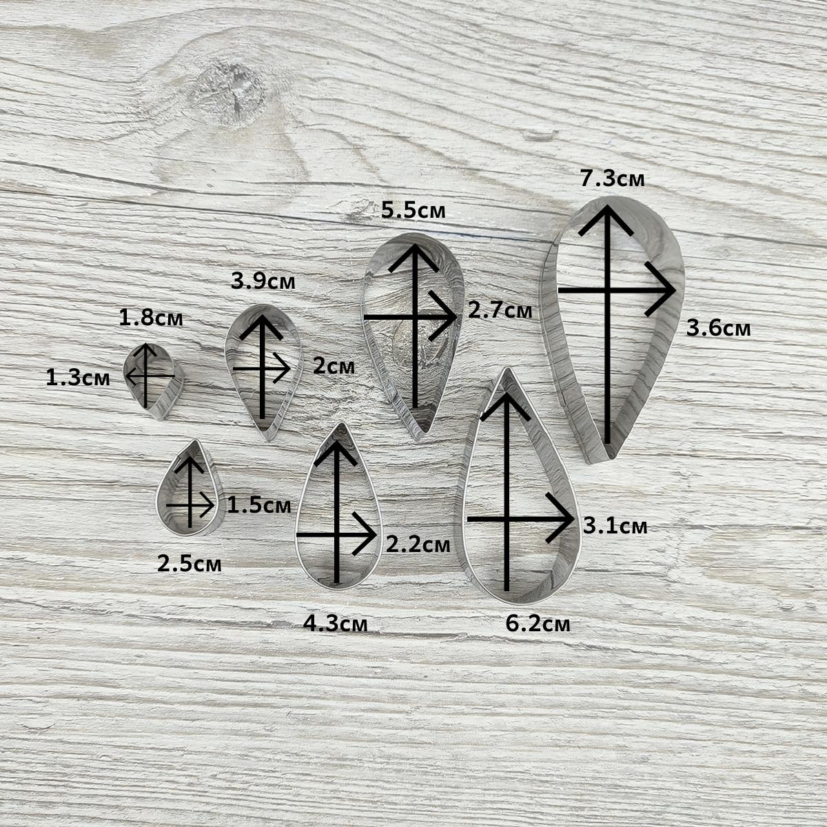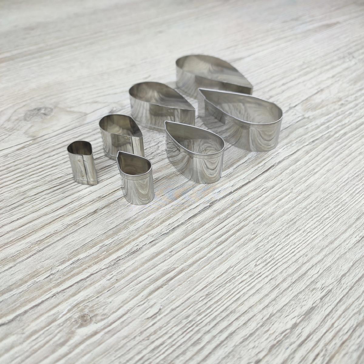 Размер форм: 7,3 см х 3,6 см; 6,2 см х 3,1; 5,5 см х 2,7 см; 4,3 см х 2,2 см; 3,9 см х 2см; 2,5 см х 1,5 см; 1,8 см х 1,3см; Высота: 2см