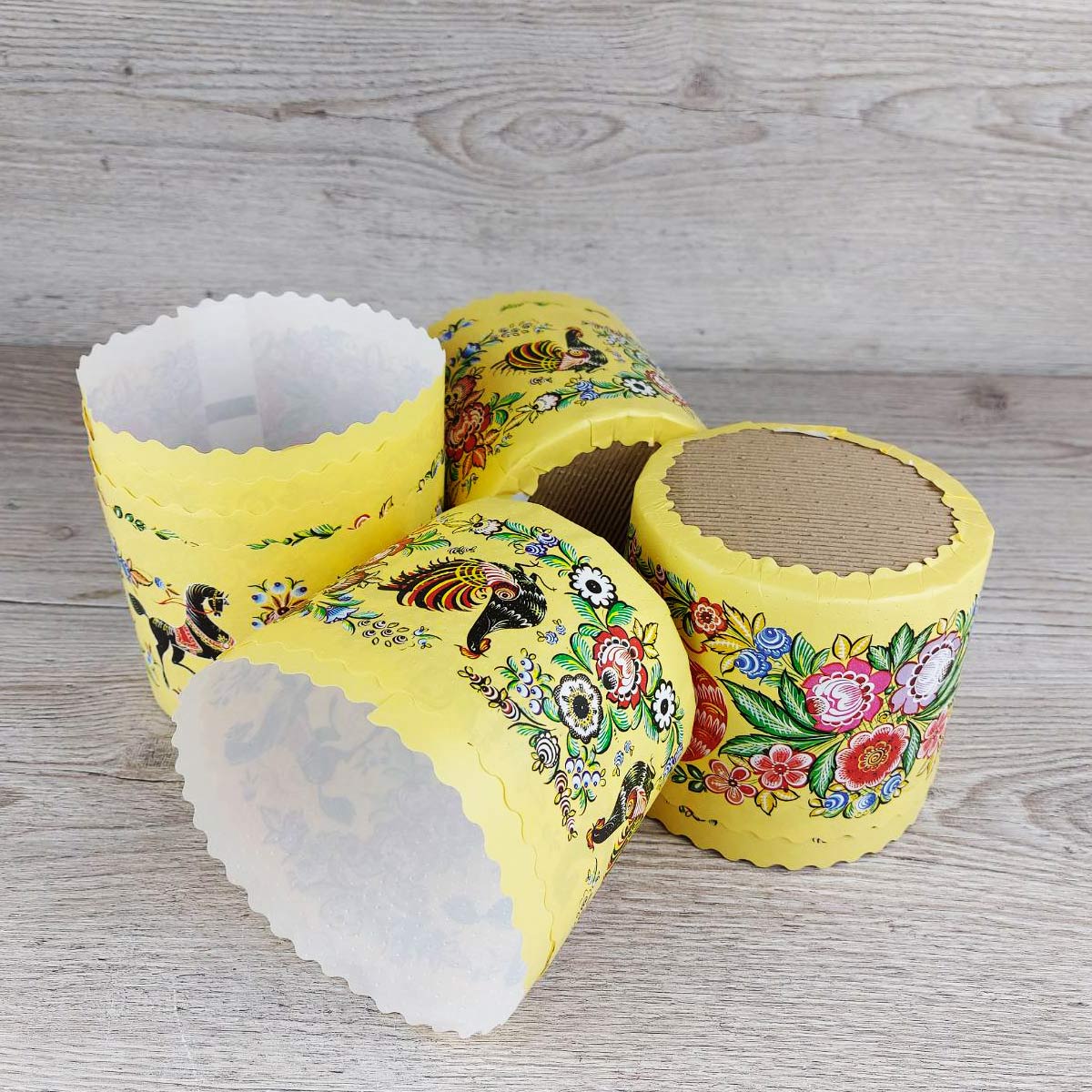 Описание: Представляют собой одноразовые формы из специальной бумаги с рисунком и картонного перфорированного дна для выпечки и последующего хранения куличей.