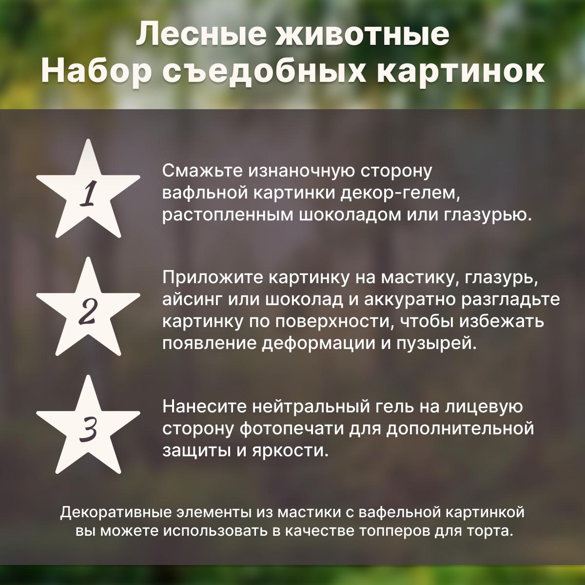 Создайте уникальный декор для ваших кондитерских изделий с помощью набора съедобных картинок "Лесные животные". В комплекте 12 изображений различных обитателей леса, выполненных с высокой детализацией. Эти картинки изготовлены из безопасных пищевых материалов и легко крепятся на торты, пирожные, кексы или печенье. Они не влияют на вкус десерта, но значительно улучшают его внешний вид, делая каждое изделие оригинальным и запоминающимся.